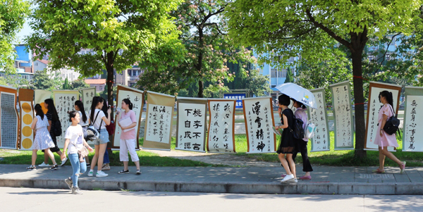本网讯 6月16日,我院举办“行云流水绘丹青”书法展,共展出师生书法作品37幅,涉及行书、楷书、隶书等字体。本次展览由院团委主办,书画协会承办,展览为期三天。(见习记者 彭念 熊姿/文 胡秉昶/摄)