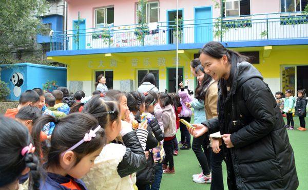 当天下午,外国语系团总支组织的11名青年志愿者来到精彩双语幼儿园,为那里的孩子带去了爱和温暖。活动中,志愿者用英语与幼儿园的师生们互动交流,进行了小课堂、户外活动、赠送小礼物等爱心活动。韩语5141张姗姗说:“能为孩子们带去爱与欢乐,让他们能够在欢声笑语中健康成长。同样也给我们自己带来快乐和美好。”