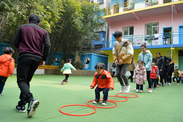 青年志愿者同幼儿园的孩子一起玩跳圈游戏