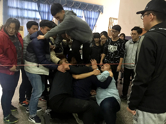 活动分上午、下午两场。现场气氛热烈,活动紧张而刺激。上午,在田径运动场,学生会全体成员分小组开展了包括“珠行万里”、“达芬奇密码”、“驿站传书”等项目的素质拓展;下午,在工会三楼,开展了“穿越火线”、“挑战150”、“抢滩登陆”等项目的训练。新颖有趣的游戏激发了同学们的参与热情,大家齐心协力、全心投入,在优异的表现中进一步提升了团队意识,体验了分工协作、团结互助和挑战自我的重要性。