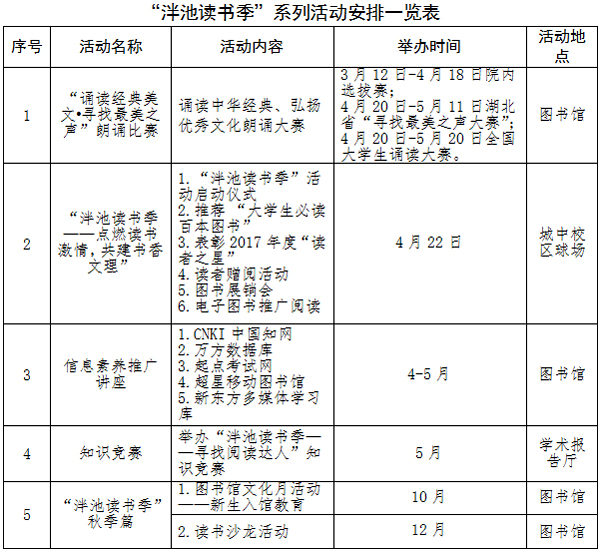 为深入贯彻落实习近平新时代中国特色社会主义思想和党的十九大精神,扎实推动新时代全民阅读工作,繁荣校园文化,建设书香校园,在“4 ▪23世界读书日”到来之际,组织与宣传部、图书馆、团委将联合举办第四届“泮池读书季”系列活动。具体活动安排如下: