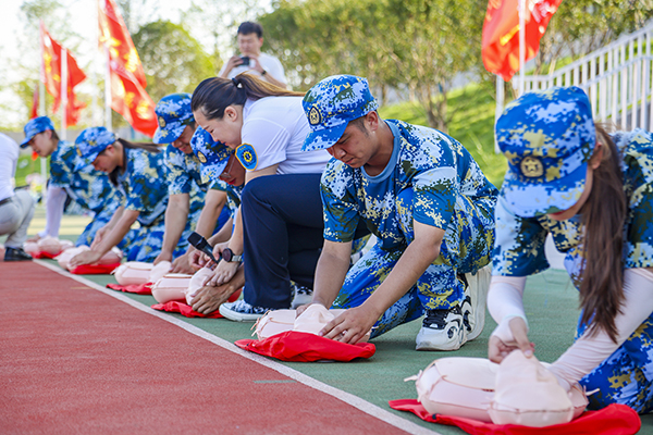 足球场上,穿着迷彩军训服的大学生们席地而坐,市急救中心培训师丁璐结合培训模型,通过分步骤、慢动作操作演示如何判断呼吸、心跳骤停、打开气道、人工呼吸、心肺复苏等急救法,一边详细讲解心肺复苏术的操作要点,一边进行标准化的师范操作。