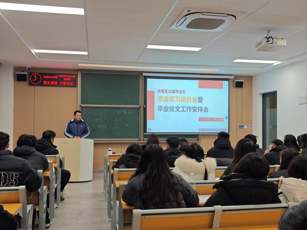 毕业实习动员会及论文工作安排会的举行,标志着体育系2025届毕业生实习和论文工作的正式开始。会议使学生对实习和论文任务要求有了明确了解,为后续工作顺利进行打下基础。相信在领导、教师和学生共同努力下,2025届毕业生将在实习和论文中取得佳绩,开启未来发展新篇章。