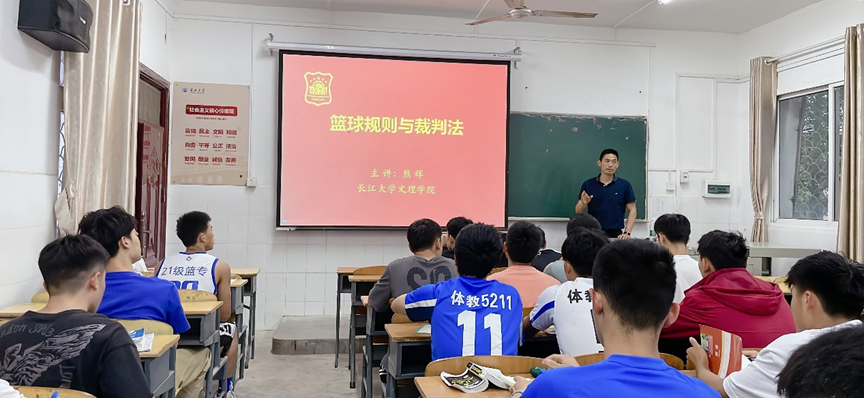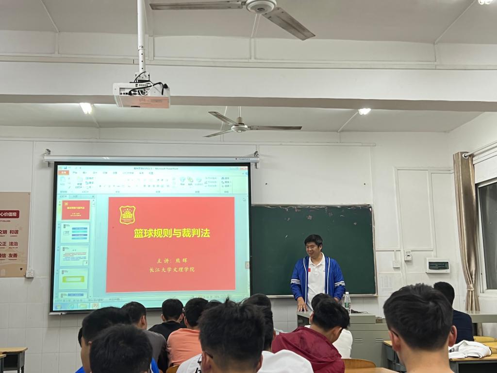 本网讯(通讯员 姚立)5月17日晚,在西校区4教进行了第十八届“文理杯”篮球赛的裁判员培训。主讲人是本次赛事的裁判长熊辉老师。体育系主任介博和全体教师、学生裁判员参加了本次培训。
