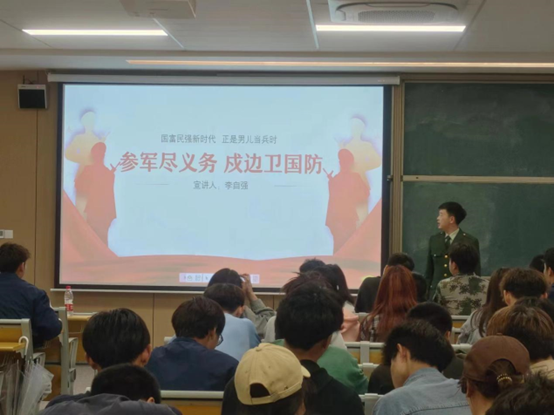 第二个部分就是由老兵团李自强同学宣讲有关征兵方面的内容。首先他给我们简单介绍了自己的亲身经历,其次他着重讲述了国防的意义,最后他详细的讲述了征兵的条件要求,应征入伍的基本流程和退役士兵的优惠政策。在不同的人心中,理想的青春有着不同的颜色。但选择参军入伍无疑是最鲜艳的红色。这不是对自己的一次挑战,更是一种突破。参军,可以使我们的能力得到淬炼,使我们的心智更加坚韧、成熟,我们更能在奋斗和拼搏中体会到人生的价值和意义。总之,选择参军报国是对国家的忠诚,是对青春的热爱,是一次无悔的选择。