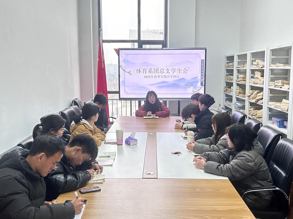 本网讯(通讯员尧喆豪)为全面部署新学期团学工作,加强团学干部队伍建设,体育系于2025年2月25日下午4:30在系部会议室召开了2025年春季学期团总支学生会开学工作例会。本次会议由体育系党总支副书记赵婉君主持,全体团学干部参加会议。