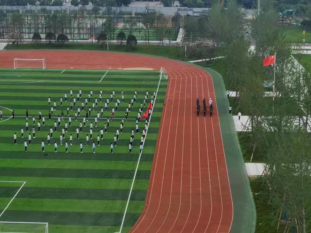 6点55分,随着主持人宣布升旗仪式正式开始,国旗护卫队队员们踏着矫健的步伐将五星红旗护送至升旗台,于7点整准时奏响国歌,在全体师生的注目礼下,五星红旗冉冉升起,迎风飘扬。