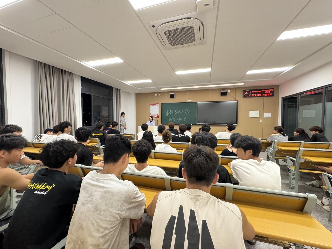 本网讯(通讯员 杨陈明琬)9月7日晚7点,体育系2025年新生见面会暨专业介绍会在教学楼B213教室举行。体育系主任介博、党总支书记邹姜、系部副主任胡杜娟、系部党总支副书记赵婉君、辅导员杨陈明琬、班主任黄贝、向艳梅、邱凤霞与全体新生共赴大学“第一课”。会议由体育系党总支副书记赵婉君主持。