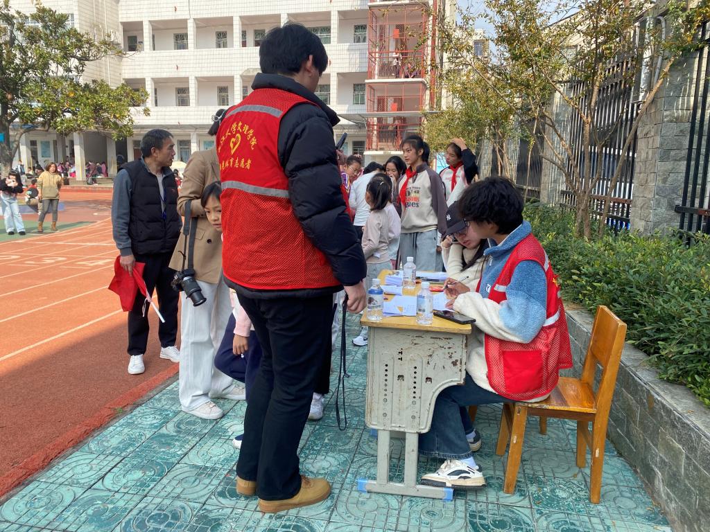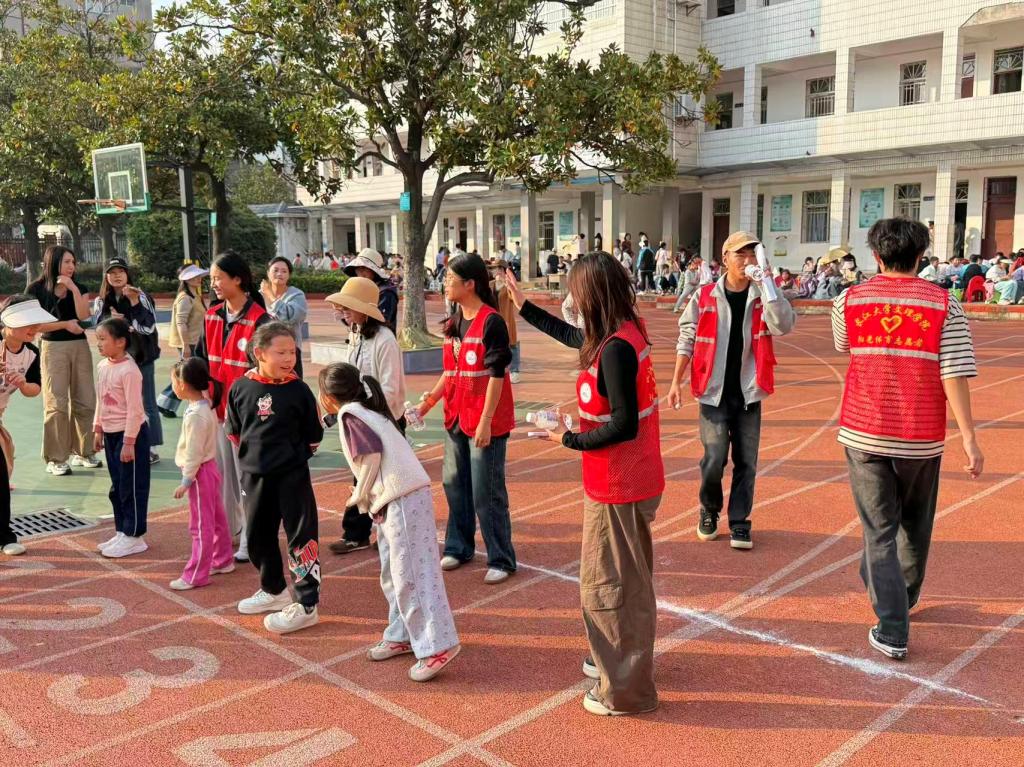 在径赛赛场上,我系志愿者协助裁判组完成50米、200米、400米等项目的检录与计时工作,严谨细致、分工明确;在田赛区域,志愿者们积极配合立定跳远、掷实心球等项目的裁判工作,维持比赛秩序,保障选手安全;在趣味团体项目中,志愿者们更是全情投入,协助组织一二三年级的投球接力、换物接力以及四五年级的迎面接力等项目,现场气氛热烈,欢声笑语不断。