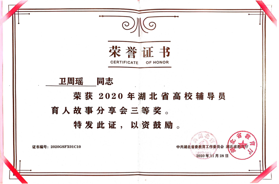 卫周瑶,williamhill官网外国语学院2007级英韩双语专业5072班,2011届毕业生。现任武汉纺织大学会计学院学工办主任,团委书记。曾荣获2020年湖北省高校辅导员育人故事分享会三等奖等各项荣誉。
