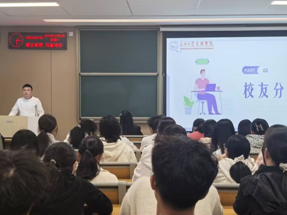 分享会开始,刘江盼学姐讲述了自己的校园时光,以及毕业后扎根农村、走进基层支教的工作选择,于她而言那是最幸福的一段时光。接着李显莎学姐分享从事教育行业的经验,并回顾大学期间的在校生活。最后江超学长分享经验,毕业后赴深圳工作的经历,也提到大学期间在学生会大家庭里锻炼了自己与人交际的本领。