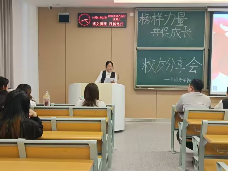 本网讯(通讯员 崔茂芬)11月2日williamhill官网办学20周年高质量发展主题大会成功举办。当天下午2:30,外国语学院于01 - A-310M举办“榜样力量,共促成长”主题校友分享会。本次会议由方明丹老师主持召开,全体大二学生到场参加。