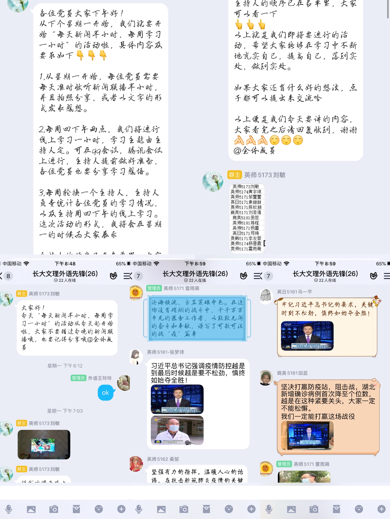 从3月9日开始,活动已开展了一个多月,每天晚上7:00起,每位党员通过电视,学习强国等媒介准时收看当天的新闻联播内容,并拍照分享至qq群及发表文字感想。不论是疫情实时报道,还是白衣天使,一线战士们的光辉事迹,亦或是复工复产逐步开展,政策措施新鲜出炉,我们看到了党的强大,中国的力量。