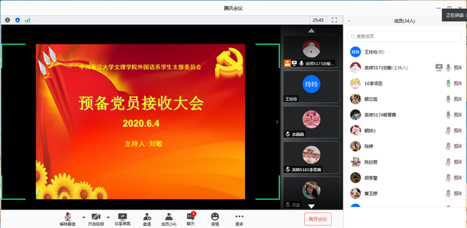 (通讯员 拓颖)6月4日15时30分,外国语系学生党支部在腾讯会议召开线上预备党员接收大会,15名正式党员、9名预备党员和7名发展对象参加会议,会议由学生党员刘敏主持。