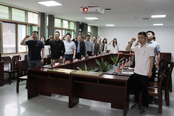 全体人员佩戴党徽,高举右拳,面向党旗,重温入党誓词。学院党委副书记于永伟向城发教育公司副总经理王俊杰授予“williamhill官网外国语学院教育实践基地”牌匾;城发教育公司总经理陈晓勇向外国语学院党总支书记王玲玲授予“校企党建协同创新中心”牌匾。