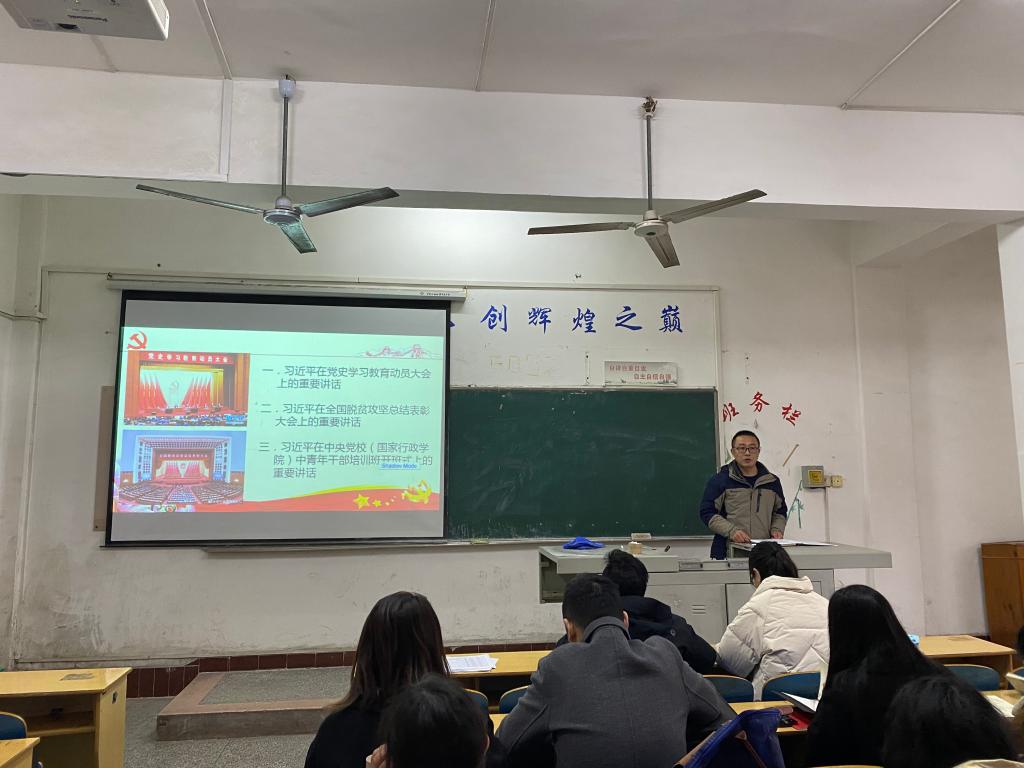 会议伊始,全体教师进行政治理论学习。学习习近平新时代中国特色社会主义思想,习近平总书记在党史学习教育动员大会上强调学党史悟思想办实事开新局以优异成绩迎接建党一百周年;习近平总书记在全国脱贫攻坚总结表彰大会上的讲话;习近平总书记主持召开中共中央政治局召开会议讨论“十四五”规划和二〇三五年远景目标纲要草案和政府工作报告审议《中国共产党普通高等学校基层组织工作条例》;习近平总书记在中央党校(国家行政学院)中青年干部培训班开班式上发表重要讲话强调在新时代新征程中奋勇争先建功立业立志做党光荣传统和优良作风的忠实传人;习近平总书记在省部级主要领导干部学习贯彻党的十九届五中全会精神专题研讨班开班式上的重要讲话;中国共产党第十九届中央纪律检查委员会第五次全体会议公报。同时深刻探讨省重要会议及文件精神,应勇在全省党史学习教育动员大会上强调学习党史传承精神砥砺品质激发活力淬炼胆识为加快建成支点走在前列谱写新篇汲取智慧力量。