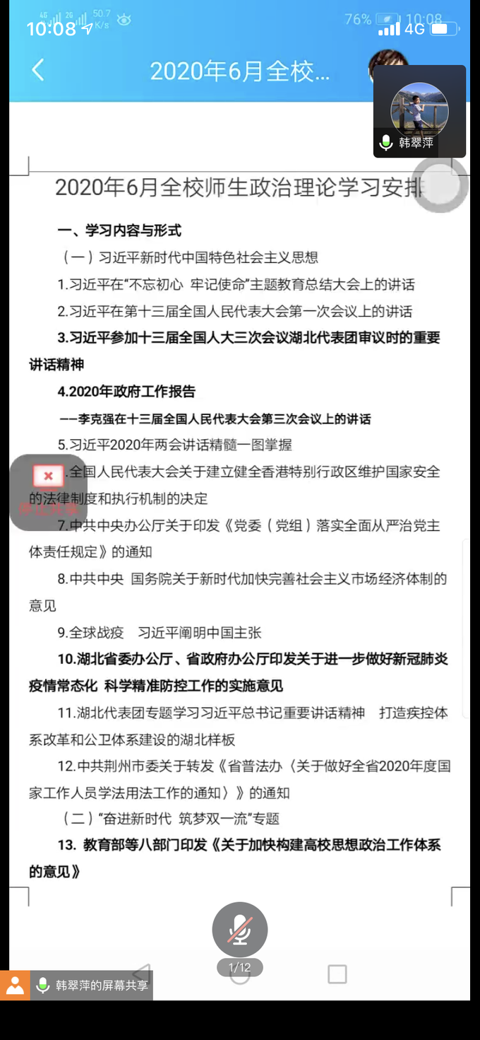 会议上,韩翠萍老师带领大家学习习近平新时代中国特色社会主义思想:习近平总书记在“不忘初心、牢记使命”主题教育总结大会上的讲话,习近平总书记在第十三届全国人民代表大会第一次会议上的讲话,2020年政府工作报告 ——李克强总理在十三届全国人民代表大会第三次会议上的讲话,习近平总书记2020年两会讲话精髓一图掌握,全国人民代表大会关于建立健全香港特别行政区维护国家安全的法律制度和执行机制的决定,中共中央办公厅关于印发《党委(党组)落实全面从严治党主体责任规定》的通知,中共中央国务院关于新时代加快完善社会主义市场经济体制的意见,全球战疫 习近平总书记阐明中国主张,湖北代表团专题学习习近平总书记重要讲话精神、打造疾控体系改革和公卫体系建设的湖北样板,中共荆州市委关于转发 《省普法办〈关于做好全省2020年度国家工作人员学法用法工作通知〉》的通知。并且自学了其他内容,以及研讨“奋进新时代筑梦双一流”专题的内容。