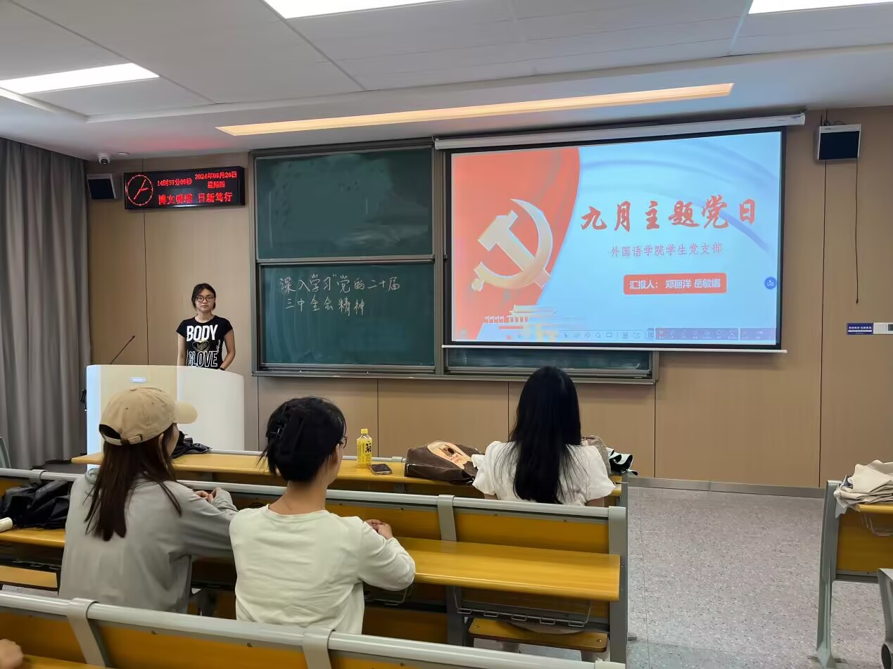 本网讯(通讯员 岳敏娜)2024年9月26日下午14:30,外国语学院学生党支部在教室C-324开展九月主题党日和政治学习。此次活动主题为,学习贯彻党的二十届三中全会精神,争当改革发展先锋。此次活动由岳敏娜同志和郑丽洋同志共同主持。