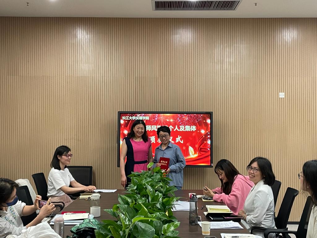 会上,副院长罗丹宣读我院师德师风先进个人、集体获奖名单。许晓艳院长、王玲玲书记、韩翠萍副院长、刘鋆锋副书记分别为获奖的大学英语教研室1个师德师风优秀集体,李漫琪、杨杨、李琳、盛珊、石从红、张丽A、高璇、许静婷、黄严9名师德师风先进个人颁发奖状,并合影留念。