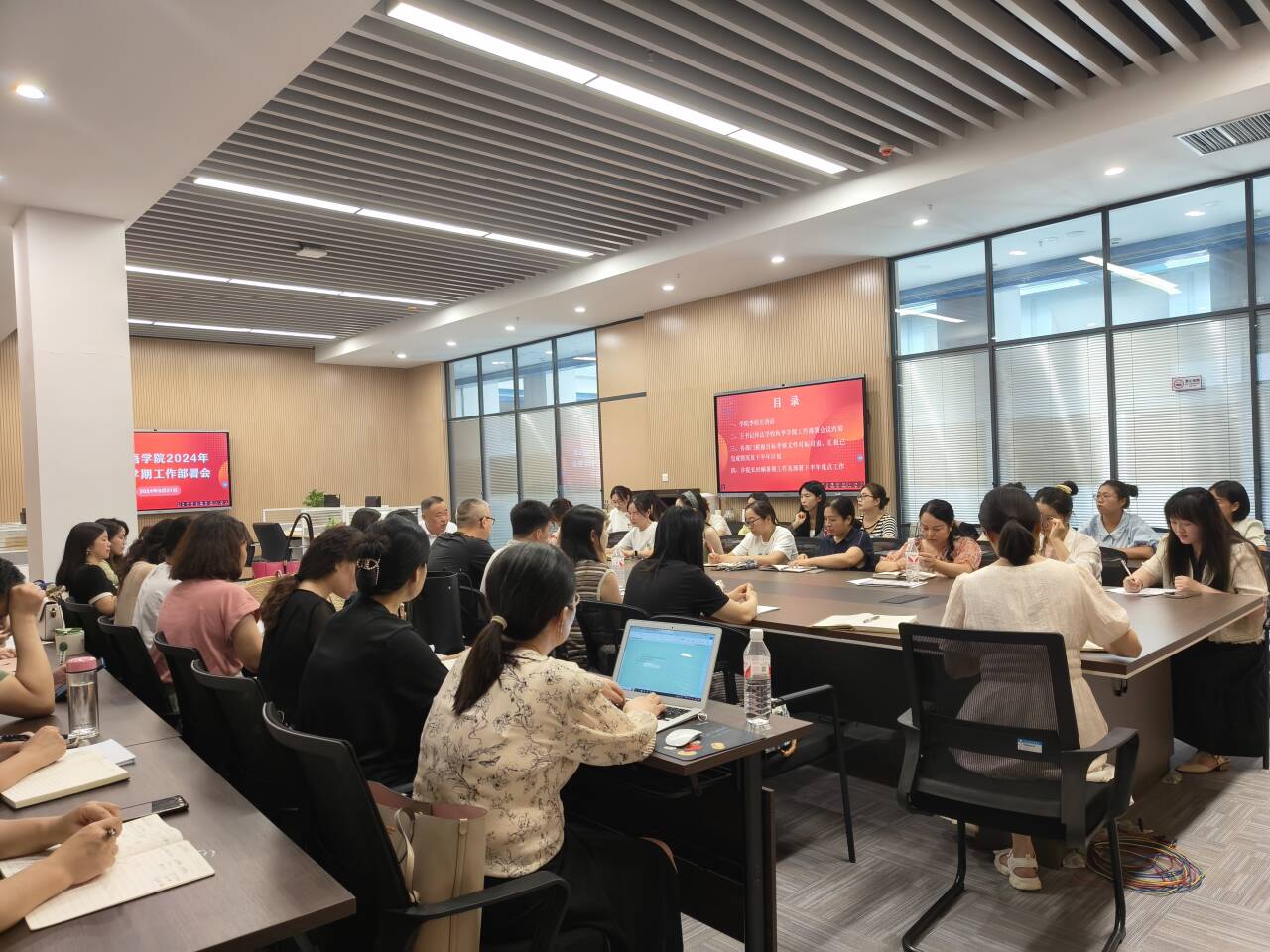 王玲玲书记传达学校秋季学期工作部署会议内容,重点介绍本院党建、教科研、招生、就业等工作。随后,各部门根据目标考核文件对标对表,汇报已完成情况及下半年计划。副院长罗丹重点介绍教学工作发展指标相关情况,就开学教学检查、开学补考等事宜进行安排;党总支副书记刘鋆锋重点介绍学生工作发展指标完成情况,重点部署开学工作、迎新工作。常务副院长韩翠萍强调教师科研、项目申报、暑期培训交流等事宜。