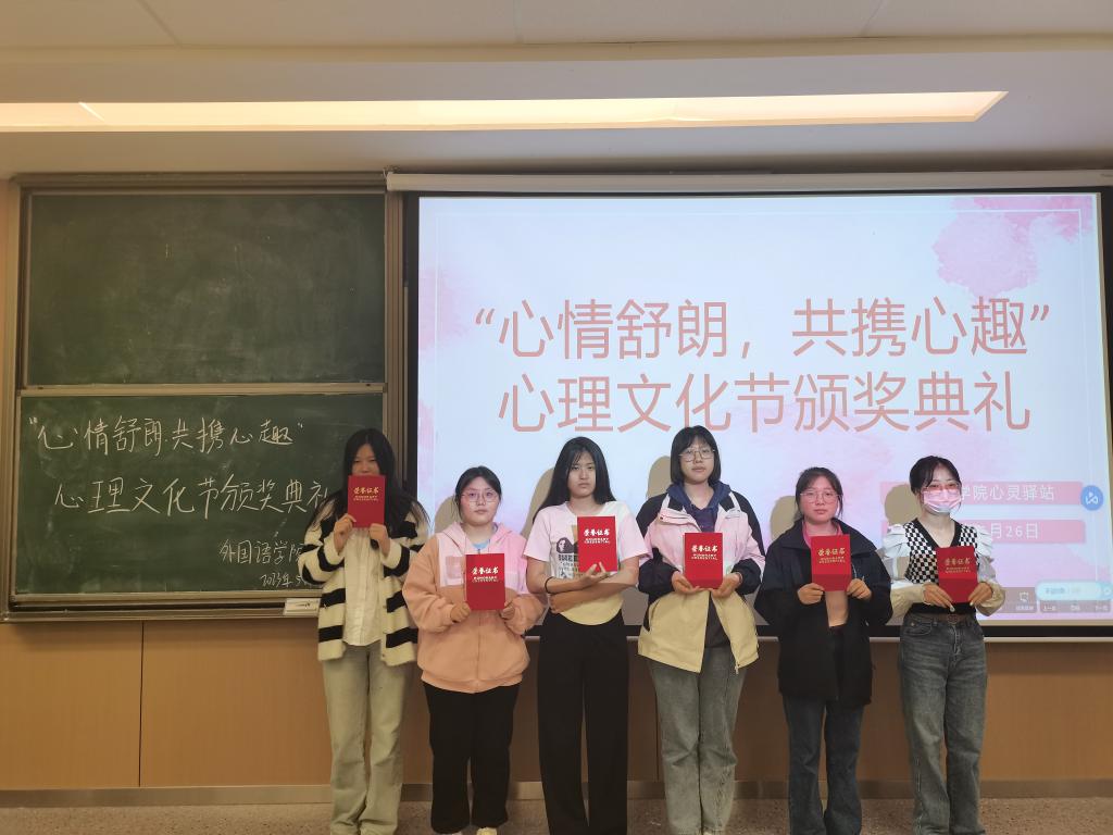 (通讯员 柏斌)5月26日早10点,“心情舒朗,共携心趣”心理文化节活动颁奖典礼圆满结束,本次典礼于A-102教室举行,由外国语学院学生会组织部部长李晓红主持。