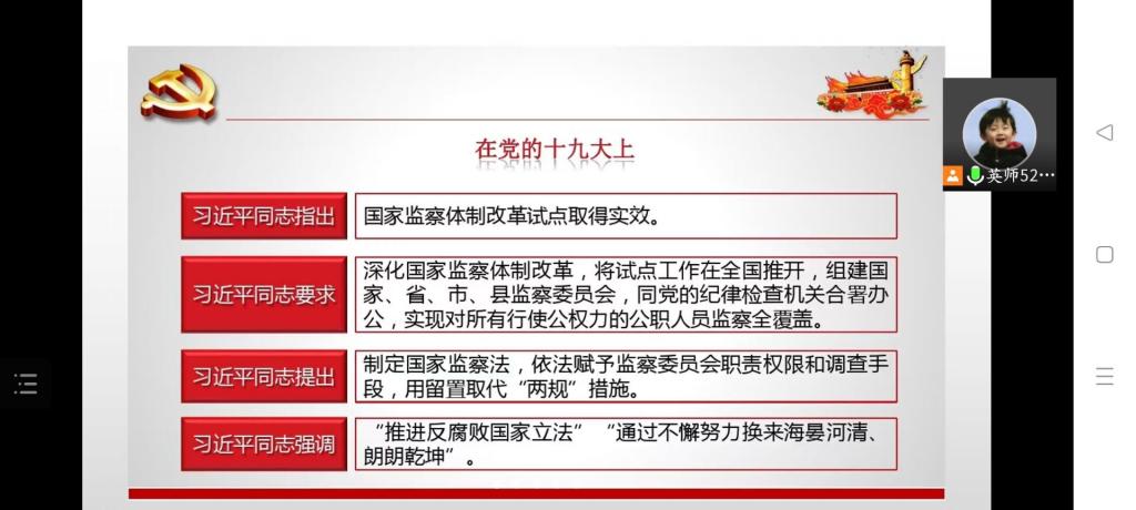 会议伊始,团支书介绍了监察法的内容,意义及监察对象。然后,概括总结培育廉洁人的五个方法并介绍相关案例。最后,为同学们播放相关宣传教育视频。