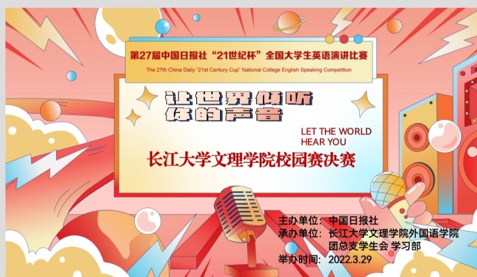 本次演讲比赛旨在规范大学生的口语水平,营造良好的学术氛围,提高学生英语口语表达能力及现场演讲能力。与此同时,激发学生们学习英语的积极性,给学生们提供了一个提升自我的平台。
