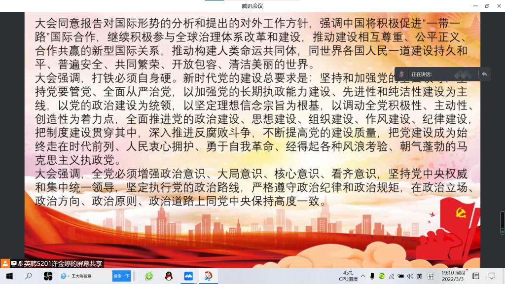 (通讯员 杨吉)3月2日至3日,外国语学院各班组织开展学习“习近平总书记在中央人大工作会议上的讲话”线上主题团课,此次团课由各班团支书主持。