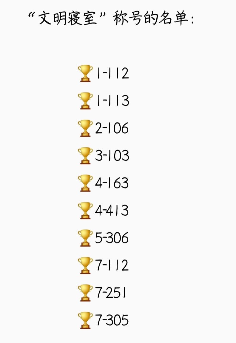 根据学生会查寝记录及实际情况我院共评选出10个文明寝室,并颁发“优秀文明寝室”标牌。名单如下: