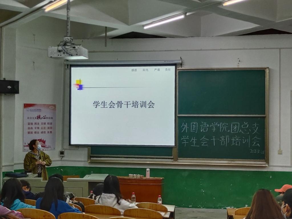 (通讯员 何宇欣)10月21日晚6点30分,外国语学院团总支学生会于2教303召开干部培训会。本次会议由组织部干事罗灿主持,辅导员雷昕、许静婷以及学生会全体成员参加。