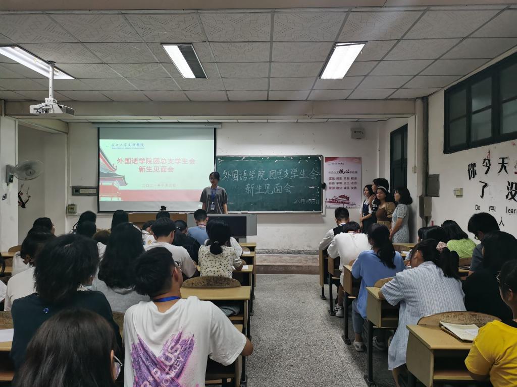 (通讯员 何宇欣)10月3日晚7点,外国语学院团总支学生会于一教308教室召开新生见面会。本次活动由组织部部长于普主持,学生会全体成员参加。