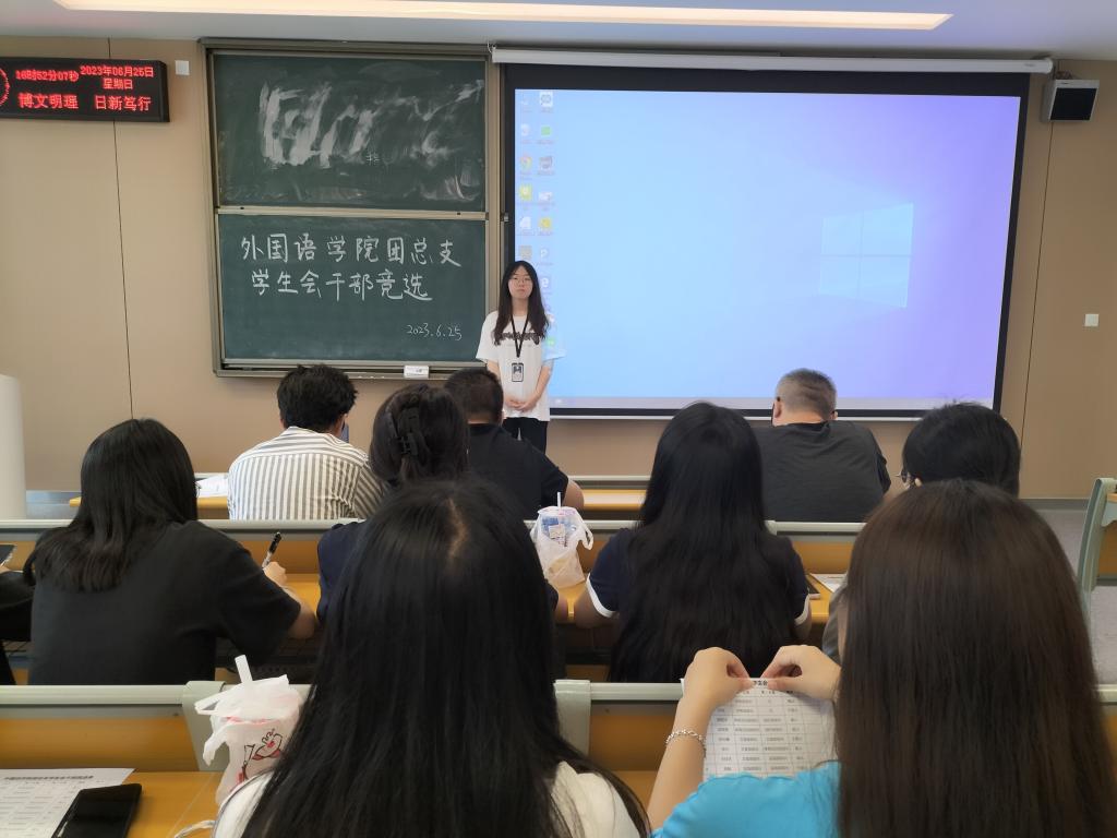 (通讯员 杨吉)6月25日,外国语学院于A-308开展干部竞选活动,外国语学院党总支副书记刘鋆峰,全体主席团及部长,面试人员参加此次活动。