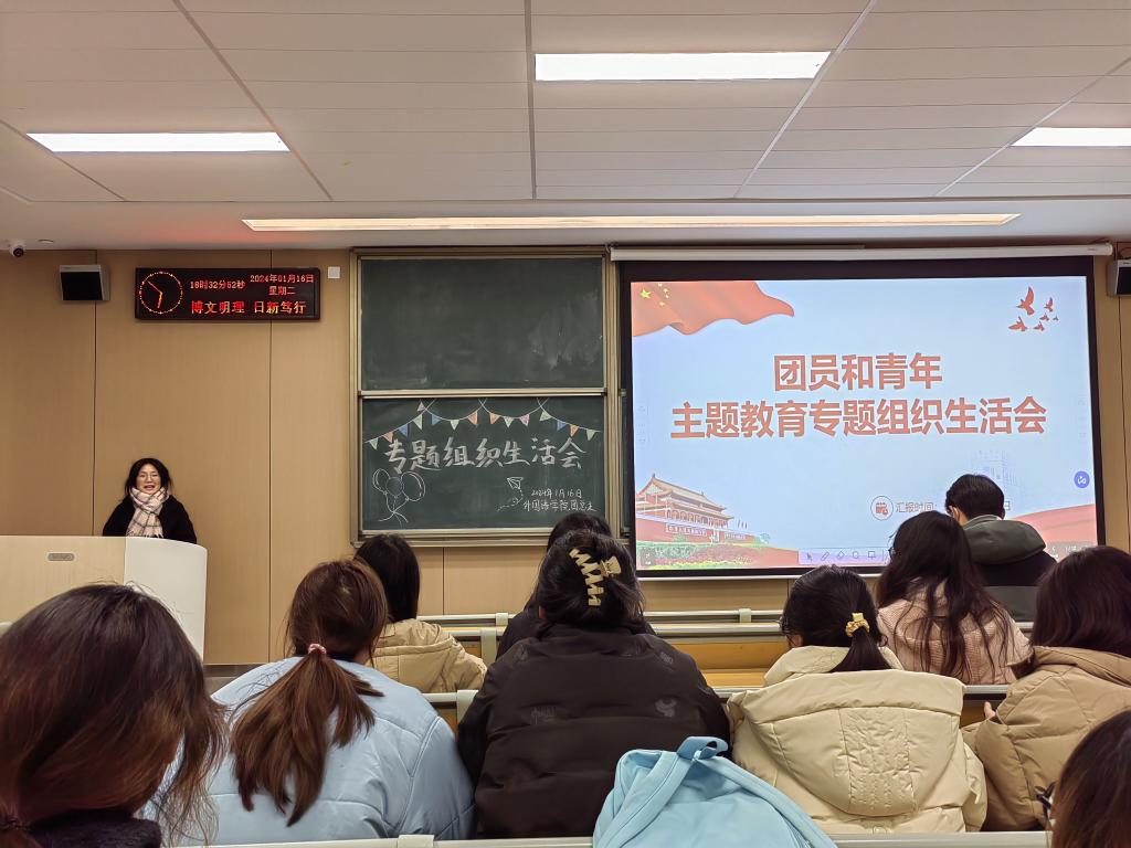 本网讯(通讯员 曹杰)为落实党的二十大作出的重大决策部署,聚焦“学思想、强党性、重实践、建新功”总要求,1月16日晚,团员和青年主题教育专题组织生活会在教学楼A-308M教室举行,本次会议由外国语学院团总支学生会组织部干事张会斯涵主持,辅导员钟燚、宋静静、侯韦,以及各班级团干部到场参加。