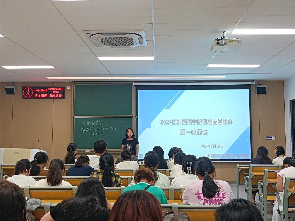 本网讯(通讯员 陶婷)9月24日晚七点,外国语学院开展了 2024 届团总支学生会第一轮面试活动。本次活动辅导员与学生会全体成员共同参与。
