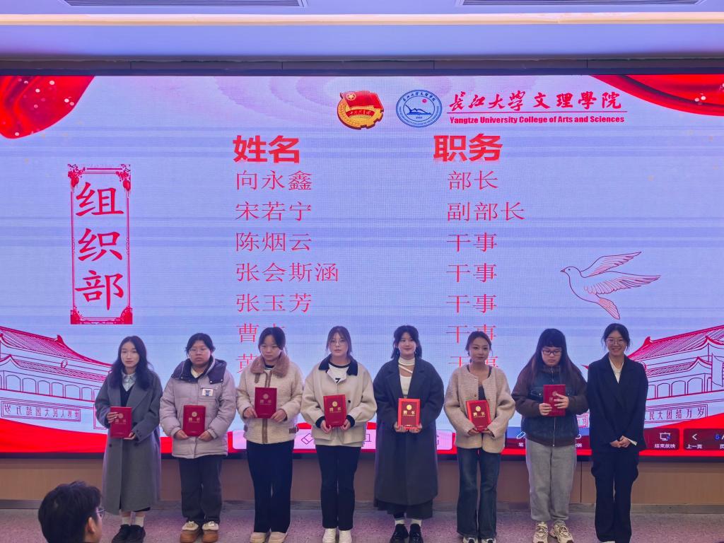 大会伊始,2023届学生会主席金玉莹上台回顾过去学生会的工作活动,向全体学生会成员致谢并对新一届提出期望与建议,期待新成员始终保持工作热情,紧密联系同学,切实服务大家。随后,老师们为各部门成员分发聘书并合影。副主席李晓红宣读《关于外国语学院2024-2025年度团总支学生会干部任命的决定》。接着,2023届全体学生会成员合影留念。