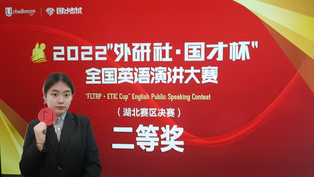 本网讯,10月29日,在2022“外研社·国才杯”全国英语演讲大赛湖北赛区决赛中,我院外国语学院学生英师5211班徐悦琳获二等奖。