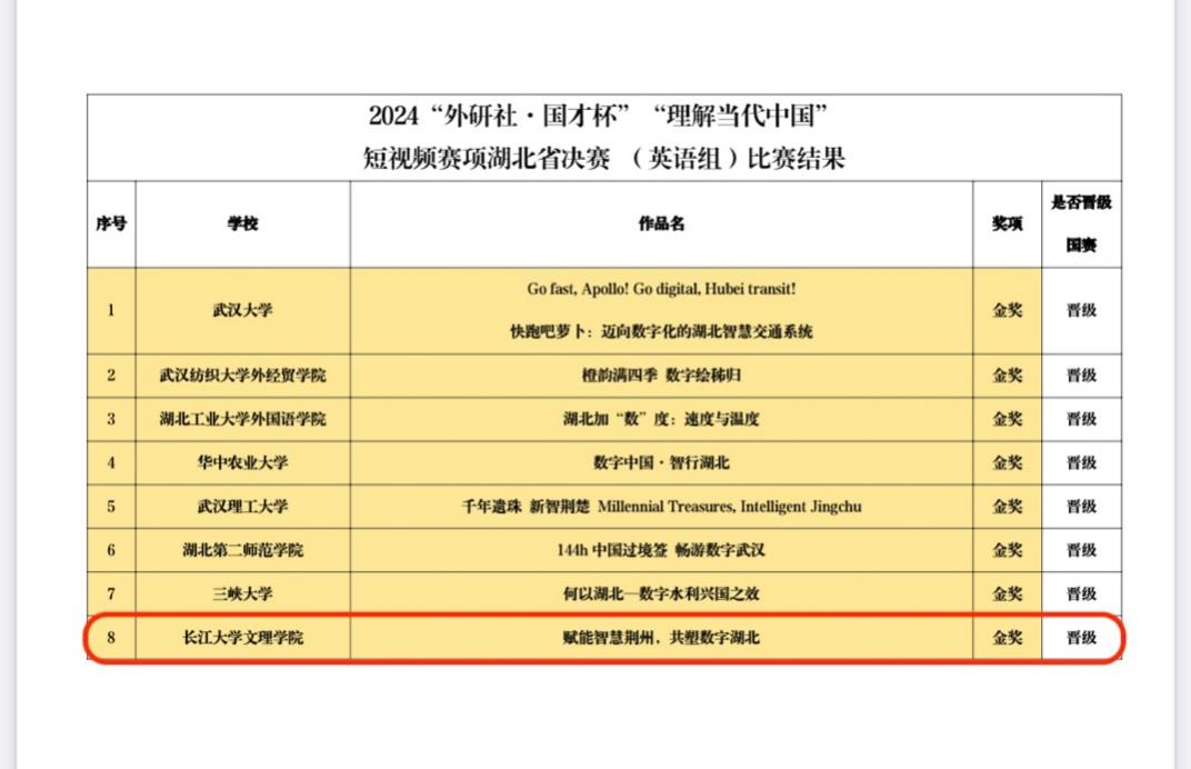 短视频赛项是2024“外研社•国才杯”“理解当代中国”全国大学生外语能力大赛新增的赛项,于10月27日在湖北大学成功举办,经由大赛委员会,专家组委会评定,其中11件作品获金奖,21件作品获银奖,22件作品获铜奖,共有20件作品代表湖北省参加国赛。