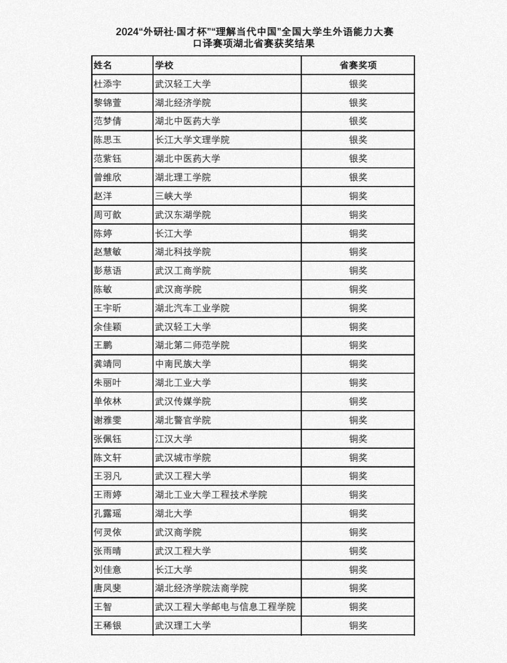 本网讯(通讯员 董蓝旗)2024年11月2日,2024年“外研社·国才杯”“理解当代中国”全国大学生外语能力大赛(湖北赛区)英语口笔译组复赛在武汉大学举行。我院学生英师5221班陈思玉荣获湖北赛区银奖。
