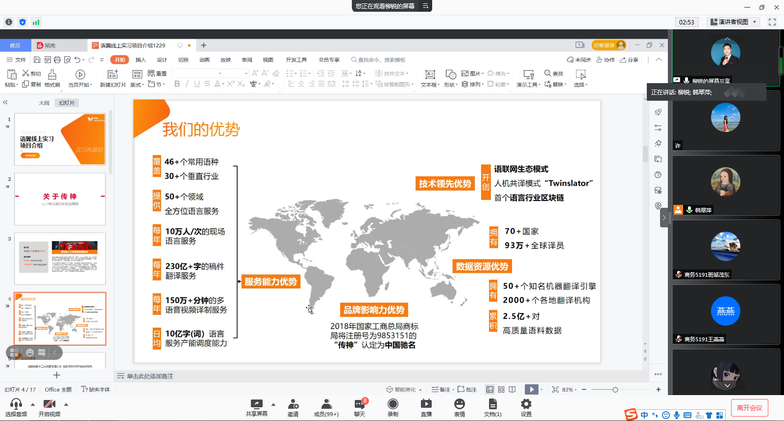 会上,传神公司湖北地区高校负责人在线介绍传神公司概况、语言服务业发展状况、信息化时代翻译行业发展趋势。传神语翼平台指导老师就本次实习项目的开展进行详细介绍,并推出“语翼”翻译平台,指导学生在翻译平台完成注册及测试,成为合格议员,顺利接收订单,并介绍了译员的工作流程。互动环节,公司相关负责人回答了同学们的提问。