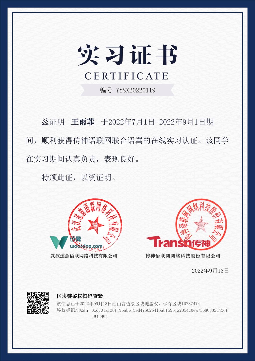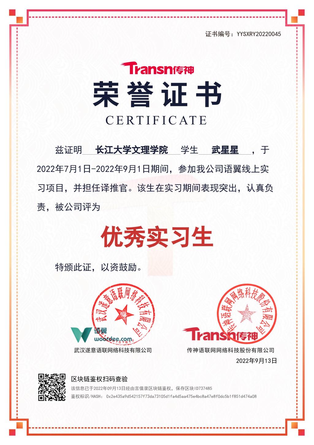 翻译实习项目在传神公司“语翼”翻译平台上开展,通过测试的同学可成为“译推官”,接收系统分配的轻任务,任务完成后获得个人积分。本次实习共有207名同学参加,其中武星星、曾羌笛、赵安勇等17名同学完成300单以上轻任务;王雨菲、杨万红、伍远兵等74名同学完成60单以上轻任务。传神公司为学生分别颁发“优秀实习生”荣誉证书和实习证书。