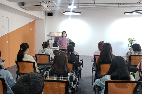 在校外企业,负责人对商务英语的专业优势和就业前景进行介绍,表示商务英语就业范围广,具有商务和英语两项专业功能,有明确的发展方向,且就业需求量大,就业环境好,并带领同学们感受商务英语的工作环境和企业氛围。