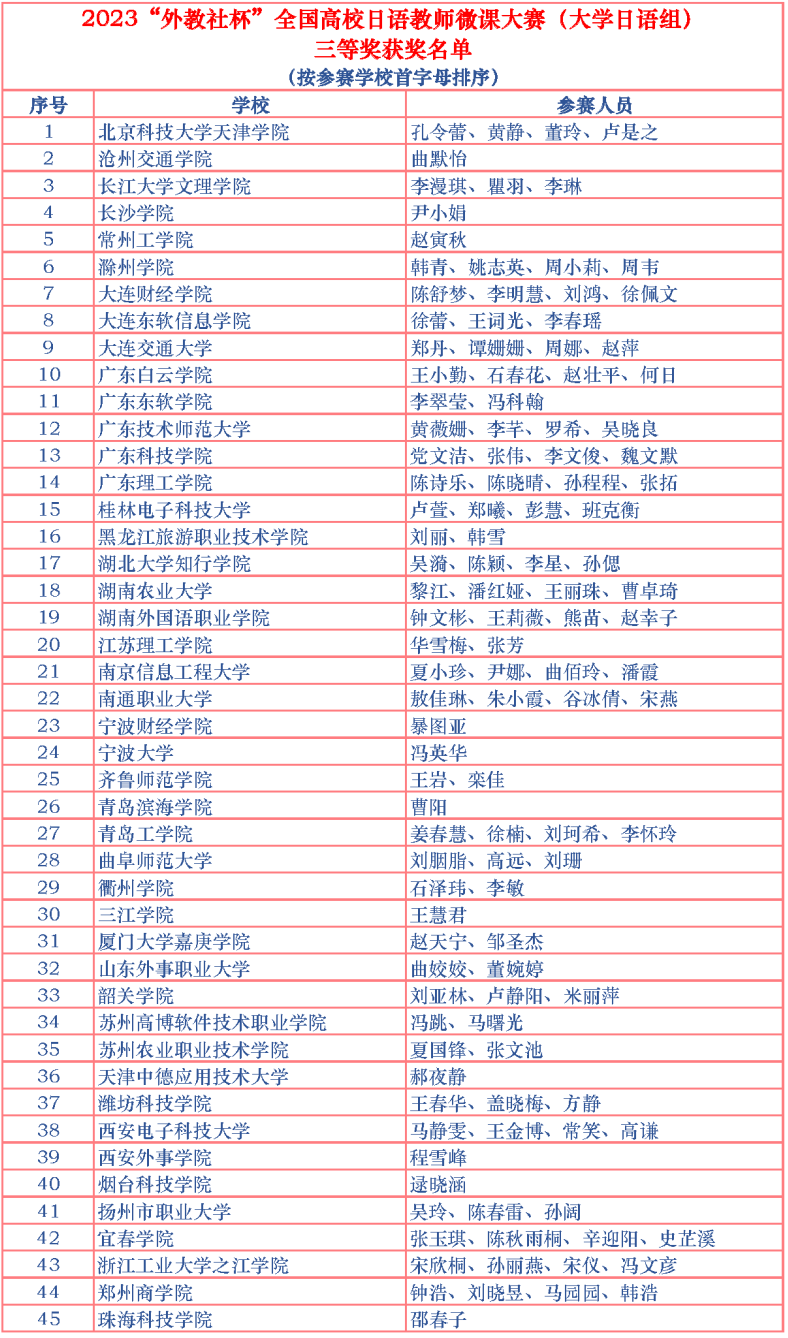 本网讯 近日,2023“外教社杯”全国高校日语教师微课大赛(大学日语组)刚刚落幕,从组委会传来佳音:williamhill官网外国语学院李漫琪、瞿羽、李琳团队的教学作品在全国150余所高校的180个参赛作品中脱颖而出,获三等奖。