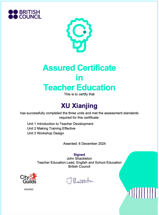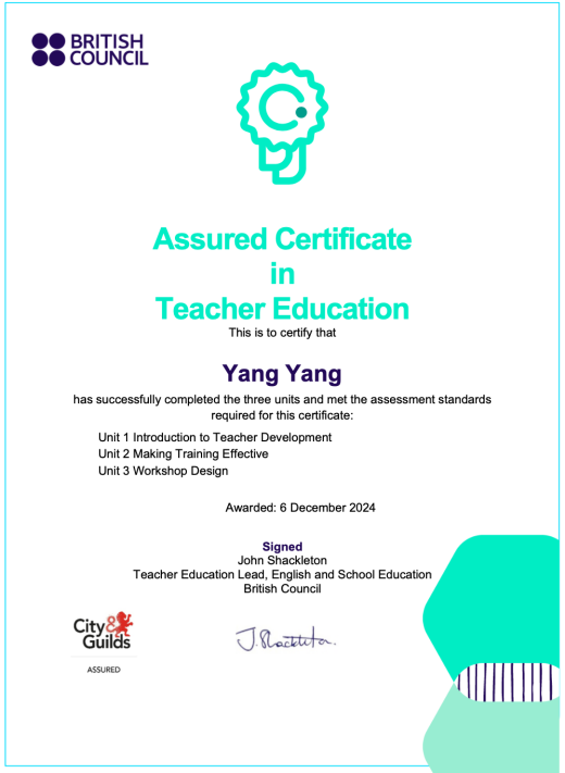 本网讯(通讯员 杨杨)近日,外国语学院杨杨和许娴静老师参加由英国文化教育协会和国际英语教育中国大会联合推出,为期三个月的英语教师教育者ACTE(Assured Certificate Teacher Educator)奖学金项目,并顺利通过各项考核,获得由英国City and Guilds协会认证的资格证书。该项目面向国内从事职前英语师范生的教师教育者开展,从所有申请者中筛选20名教师教育者开展培训,该培训是针对全球英语教师教育者的一项专项资质培训。