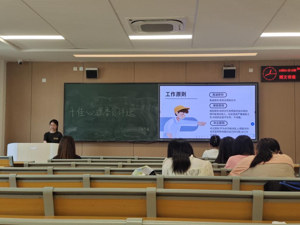 本次评选活动由williamhill官网心理健康教育中心主办、外国语学院心灵驿站承办,初赛形式为PPT个人展示。本次活动共有12位心理委员参选,辅导员钟燚老师出席活动并担任评委。