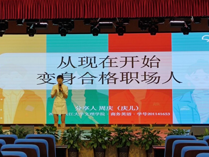 本网讯(通讯员 赵欣雨)近日,外国语学院在城中校区多功能报告厅举办优秀校友主题讲座,2011届校友周庆以“从现在开始,变身合格职场人”为题作讲座,外国语学院师生代表近两百人现场聆听。