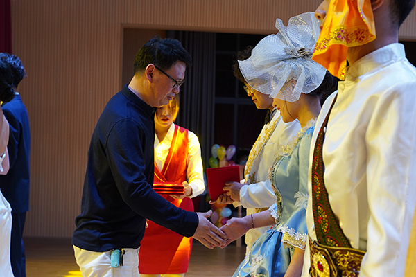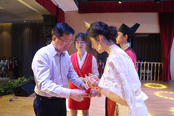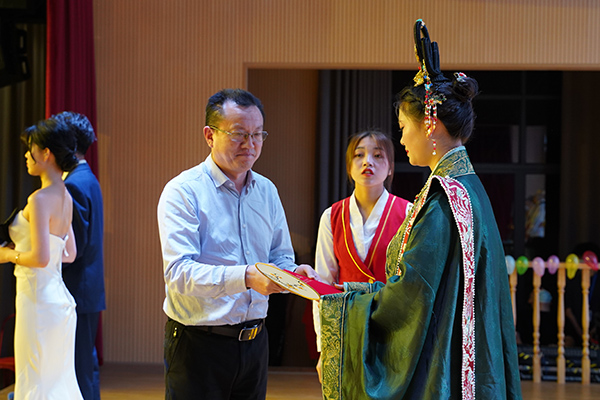 比赛现场座无虚席,乐声悠扬,青春涌动,欢呼声和掌声不断。古代汉服礼仪展示环节介绍抱拳礼、万福礼、叉手礼等5种礼仪;礼仪操展示环节,10名选手端庄大方,展现出大学生青春风采;个人才艺展示环节,3号选手杨彦培带来的舞蹈《你最最最重要》活力十足,4号选手徐嘉昊、9号选手安欣萍、10号选手周泽楷带来的朗诵《我的祖国》,表达了青年学子对祖国的热爱与祝福;国际礼仪服装展示环节,五组选手身着中国、泰国、蒙古、印度、俄罗斯等国家的服装,搭档进行走秀,展现“一带一路”沿线国家民族特色。现场还穿插有党史竞答互动和舞蹈表演,同学们踊跃参与其中,并进行抖音抽奖。