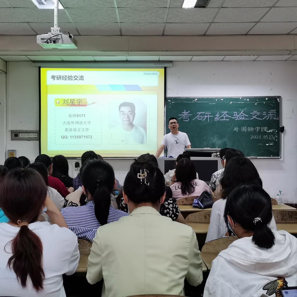 本网讯(通讯员 黄邹毅)5月13日下午,外国语学院2021年考研经验交流会在城中校区1-308教室举行。该学院党政负责人和2017级考研优秀学生、2018级全体学生参加交流会。