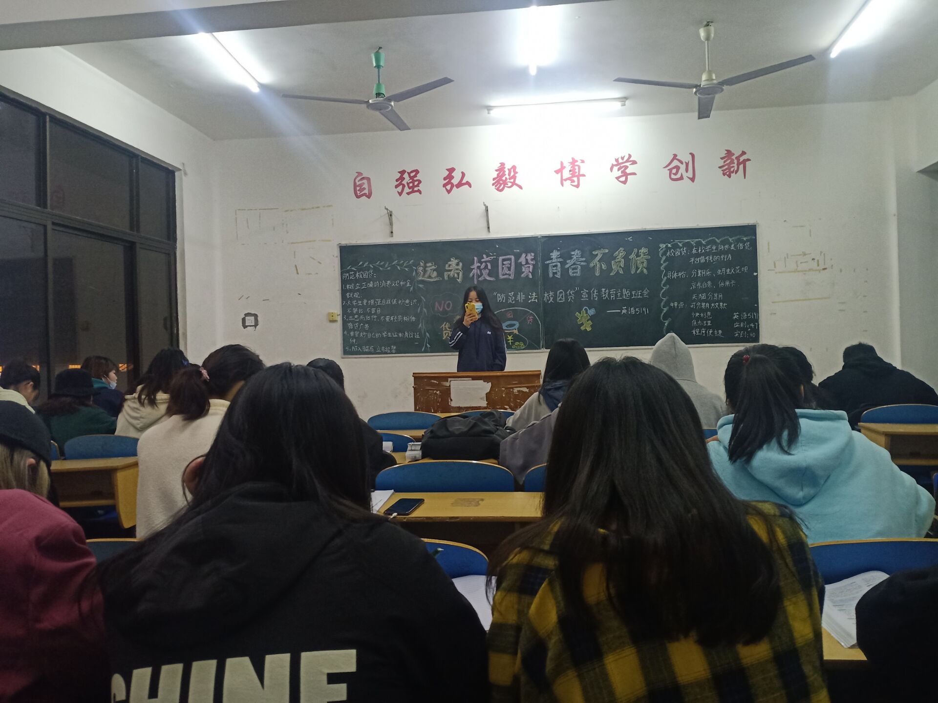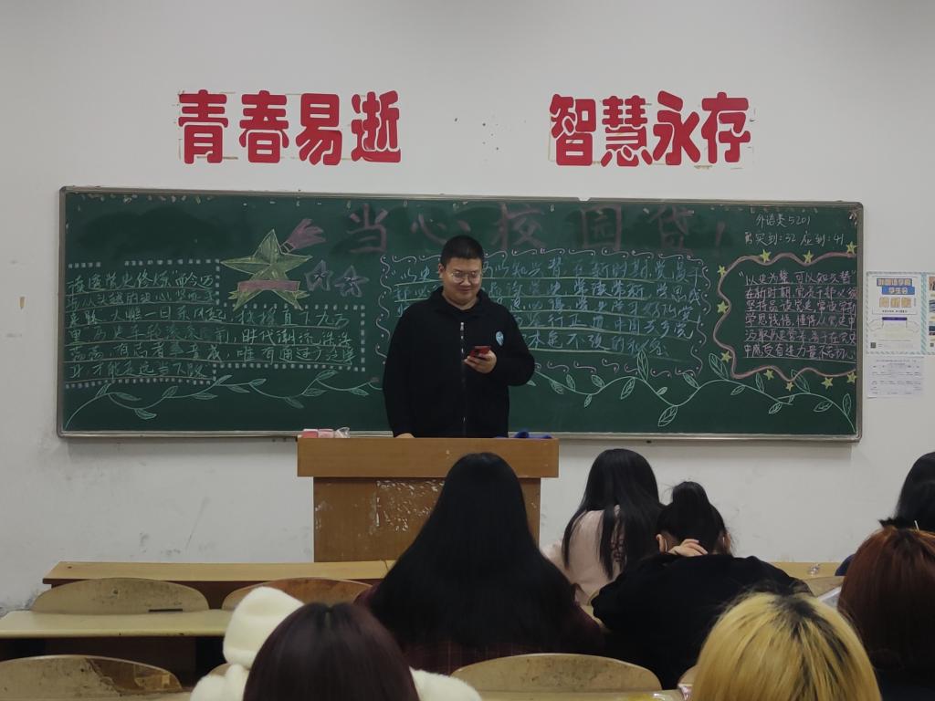 (通讯员 赵欣雨)4月11日晚七点,外国语学院各班开展“防范非法校园贷”宣传教育主题班会,本次班会由各班班委主持。