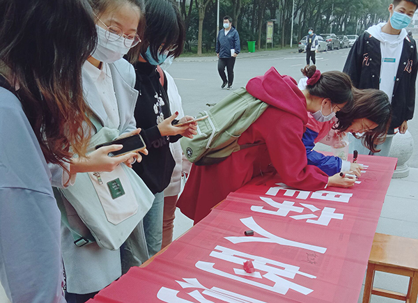 本网讯 10月30日,在“世界勤俭日”的前一天,外国语学院在城中校区一教楼前举行“环保在心中 节俭伴我行”主题签名活动。在印有宣传语的红幅上,该学院团总支学生会的志愿者们纷纷签名,表达勤俭节约的决心。一名团员干部表示,勤俭节约不仅是中华民族的传统美德,更是新一代青年的历史责任。签名活动很有意义,号召每一名青年学子从身边小事做起,反对铺张浪费,树立勤俭节约的良好风尚。 通讯员 拓颖 摄影报道