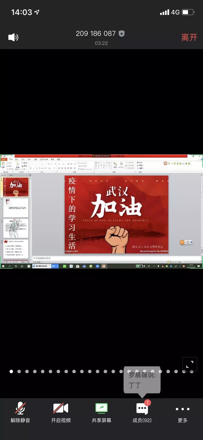 在网络班会的开展过程中,老师提到:在近一段时间内,新冠肺炎疫情每日增长的确诊人数和死亡人数,牵动着数亿中国人民的心,面对疫情的肆虐,“阻击战”不单是一道国家如何防控疫情,保障人民群众生命安全和身体健康的必答题,更是一套展现当代大学生风采、体现共青团员自觉意识、维护社会安定的综合性试卷。提醒了疫情当下的我们需要做好防疫工作,保持健康的生活方式,避免外出,合理安排作息时间和学习时间。这样的举措不仅是为自己及家人的健康添了一份保障,也为抗疫防控添了一道屏障。